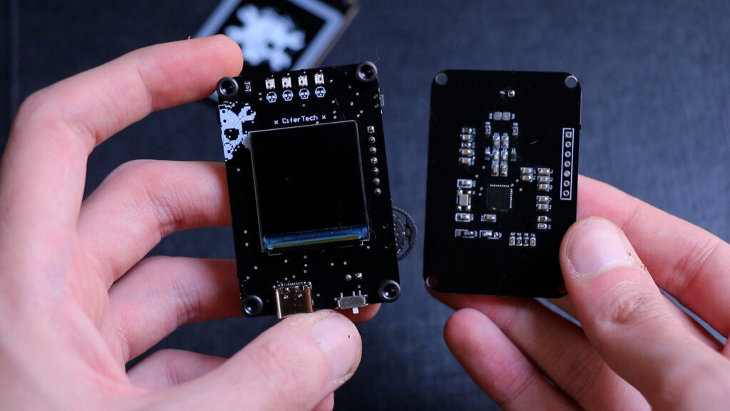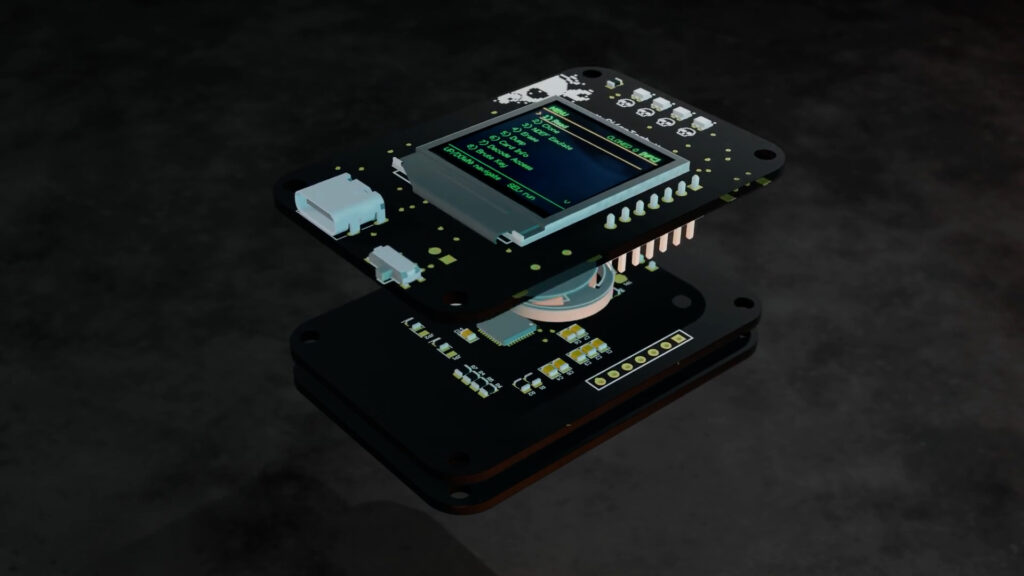 Menus are navigated with three buttons. The display has a terminal-style interface. It feels like a device, not a dev board with a screen attached.